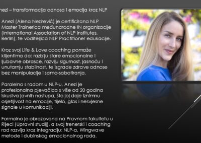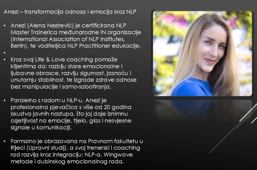 Ja sam NLP trenerica koja vodi pojedince i grupe kroz osobnu transformaciju i aktivaciju vlastitih potencijala kombinacijom komunikacijskih vještina, emocionalne inteligencije, psihološke intuicije i NLP alata. Moje iskustvo u glazbi, javnim nastupima i iz pravne i upravne sfere koje sam stekla kroz formalno obrazovanje na upravnom studiju i prethodno studiranje prava, oblikovalo je moj pristup koji je jedinstven, nekonvencionalan i snažan. Inspiriram, mentoriram i osnažujem posebno na području ljubavnih odnosa, osobne autentičnosti i izražavanja kroz jezik i glas.