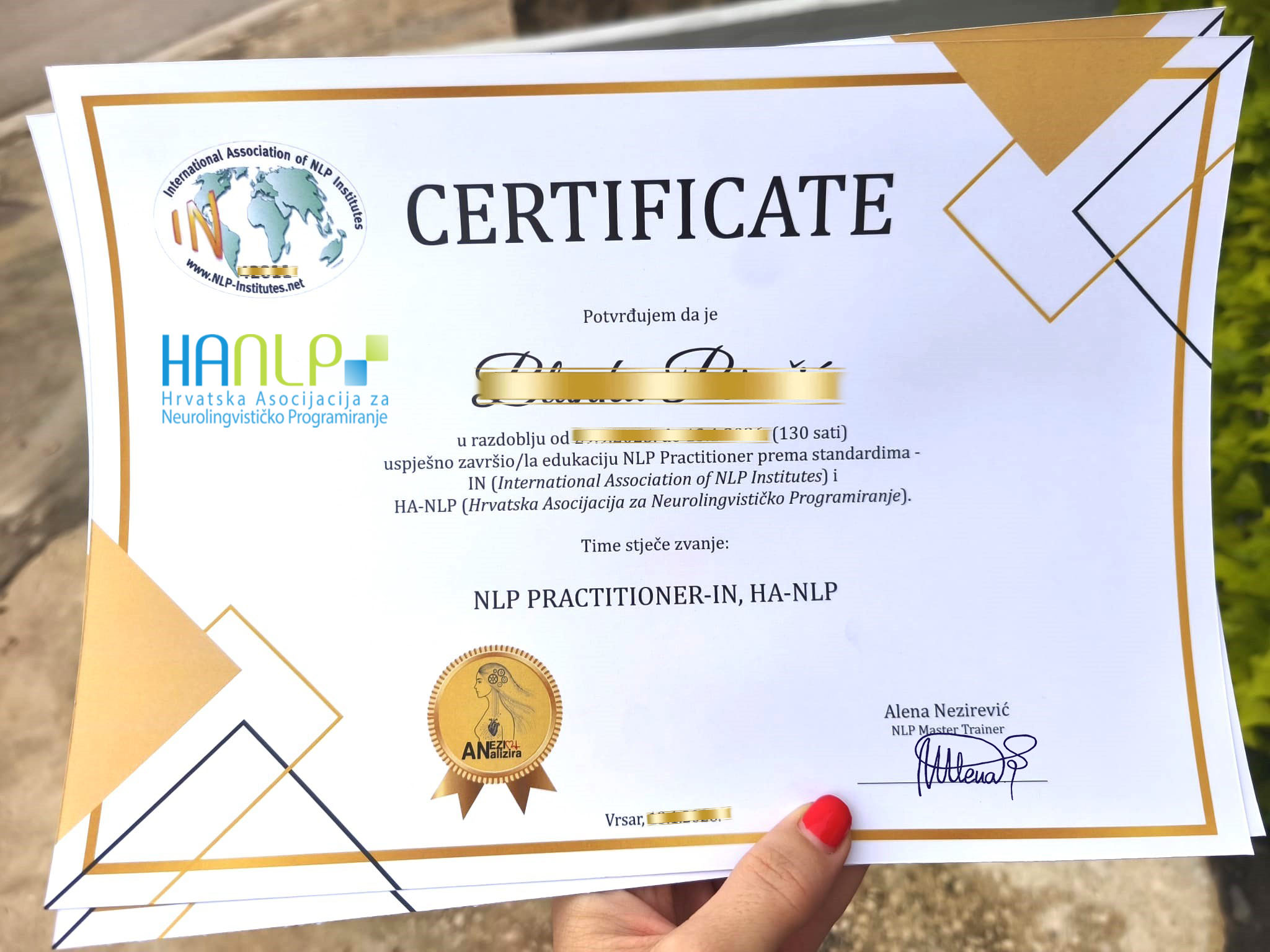 - certifikat o završenoj edukaciji u ime HANLP (Hrvatska asocijacija za neurolingvističko programiranje) i međunarodne institucije IN NLP (International Association of NLP Institutes)
